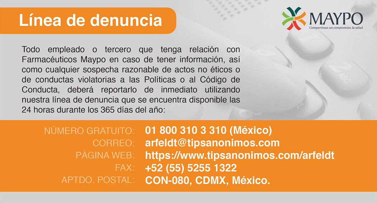 Maypo, enfatiza en tener "Cero Tolerancia y prohibición de prácticas corruptas, al soborno y pagos de facilitación", por lo que ponemos a disposición de todos los colaboradores y terceros la "Línea de Denuncia" con la finalidad de que puedan reportar cualquier violación a nuestras políticas o a la legislación nacional o internacional.